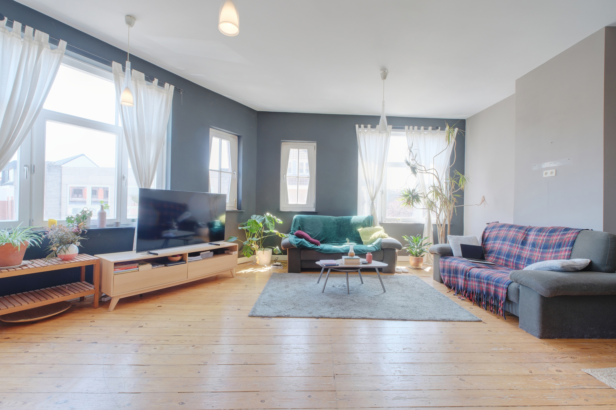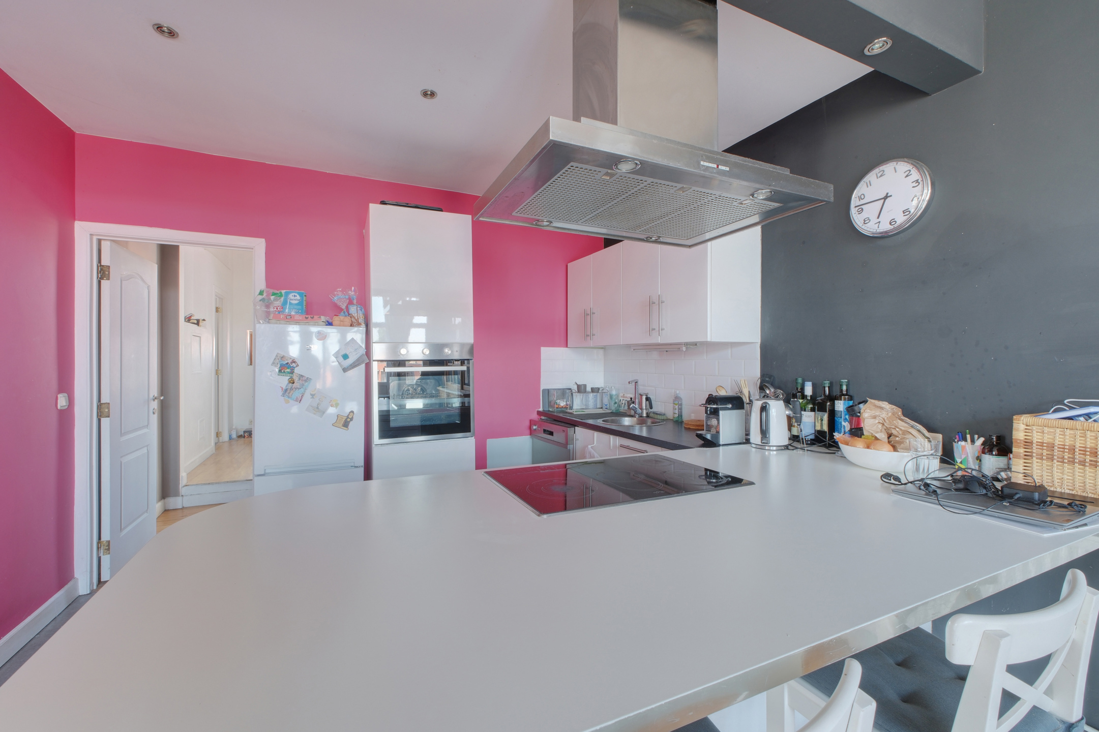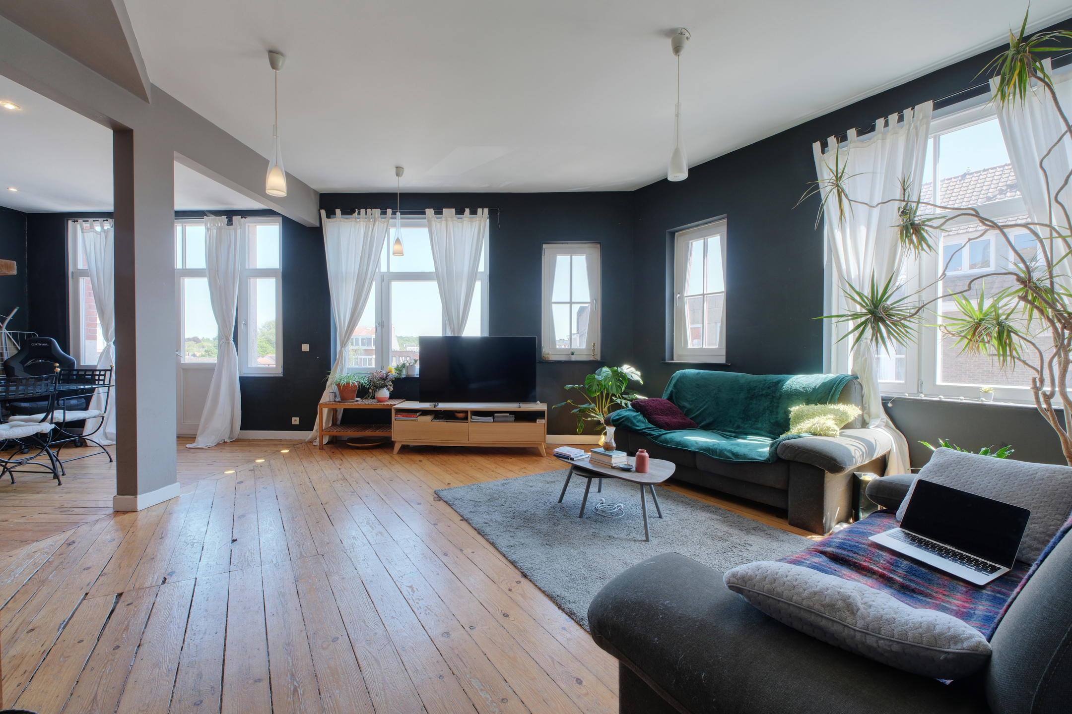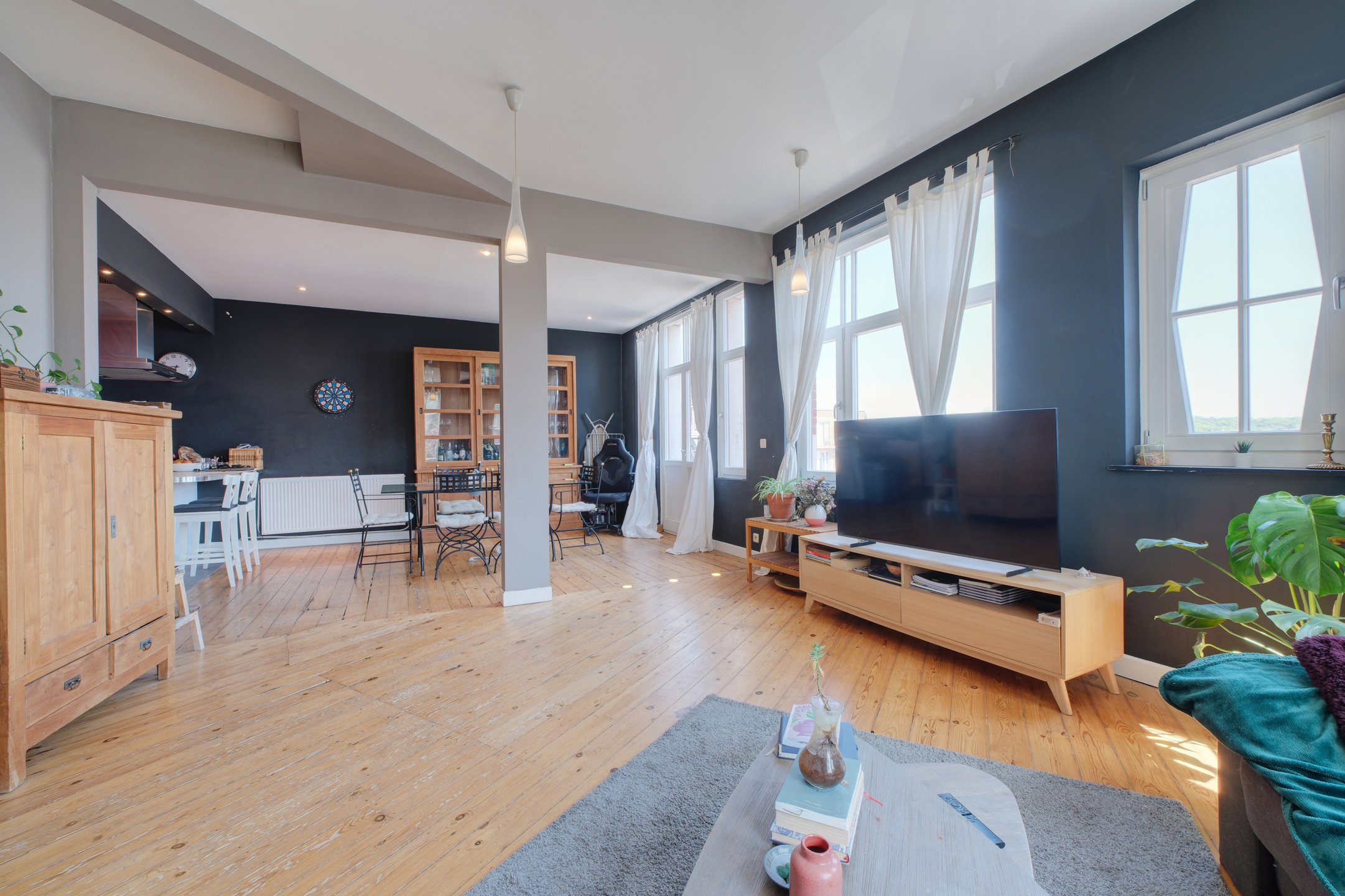 L’intérieur se distingue par un vaste séjour baigné de lumière, sans aucun vis-à-vis, avec plancher au sol, balcon et une vue sur la Place Pinoy entièrement dégagée qui apporte une sensation de calme et de sérénité. La cuisine ouverte, moderne et entièrement équipée, prolonge harmonieusement l’espace de vie, idéal pour recevoir ou profiter de beaux moments en famille.