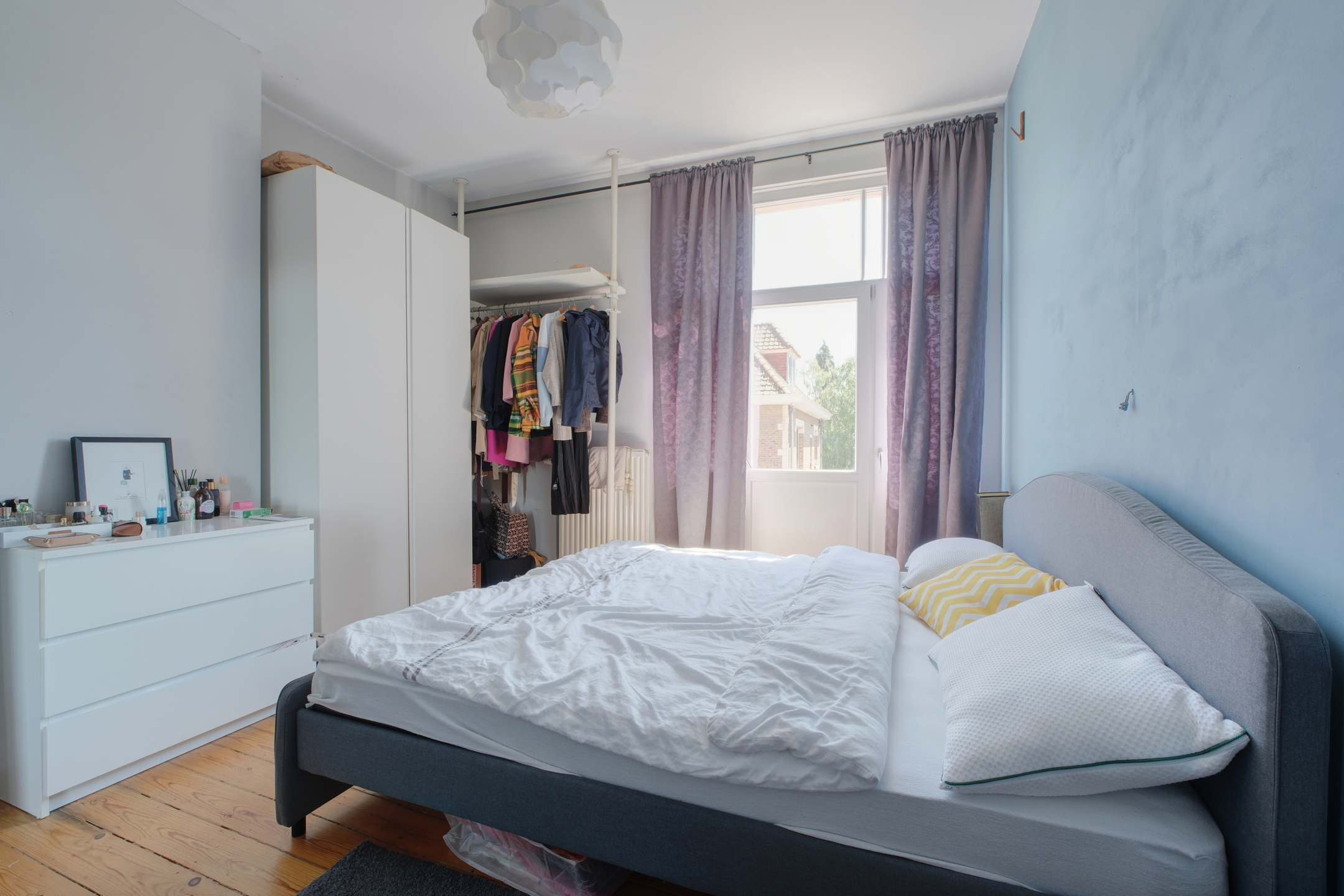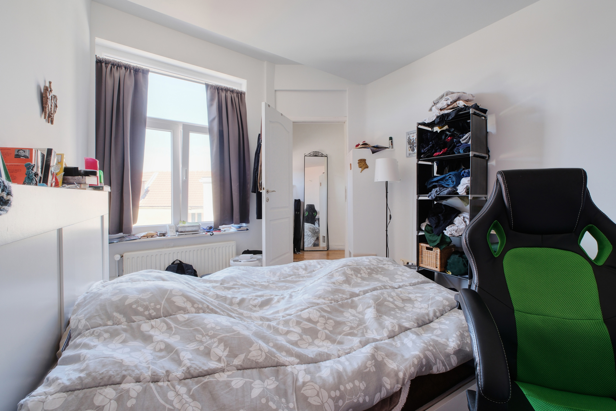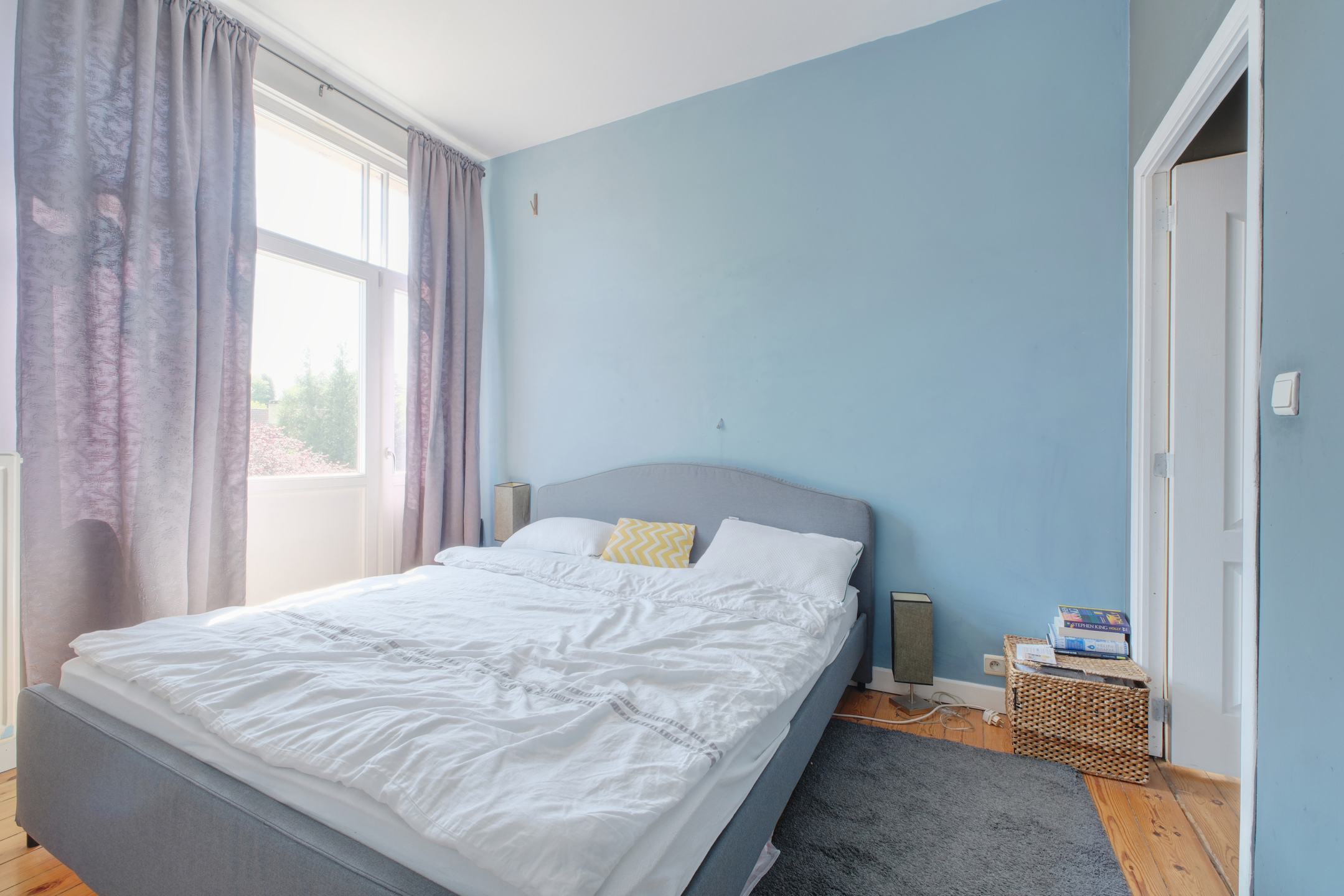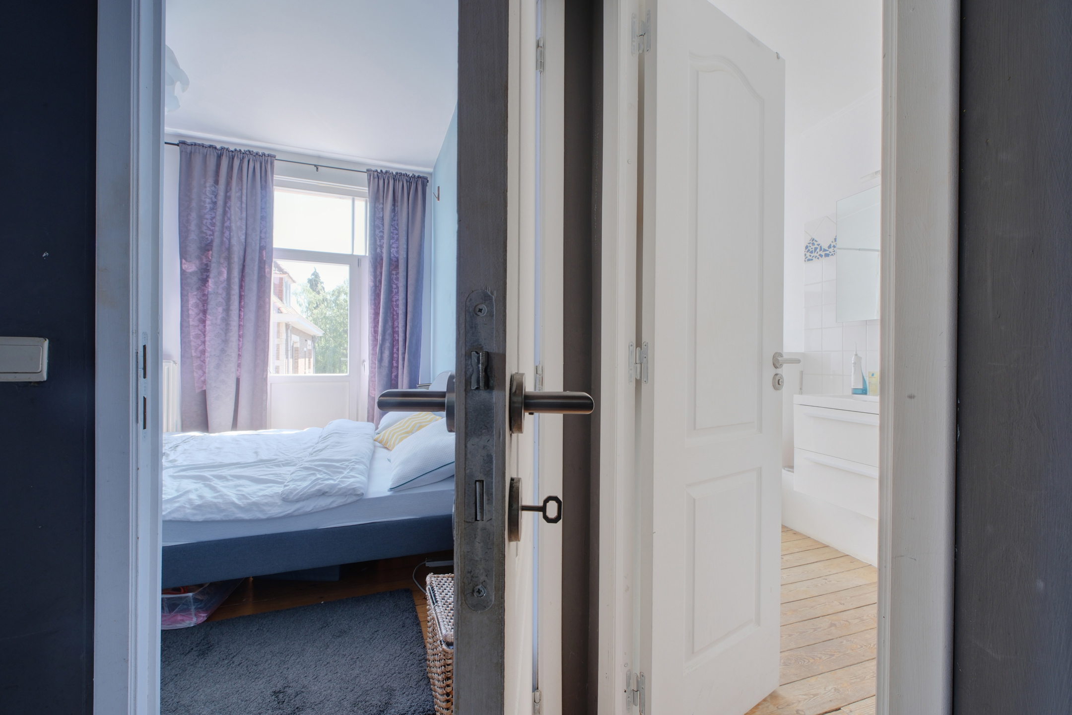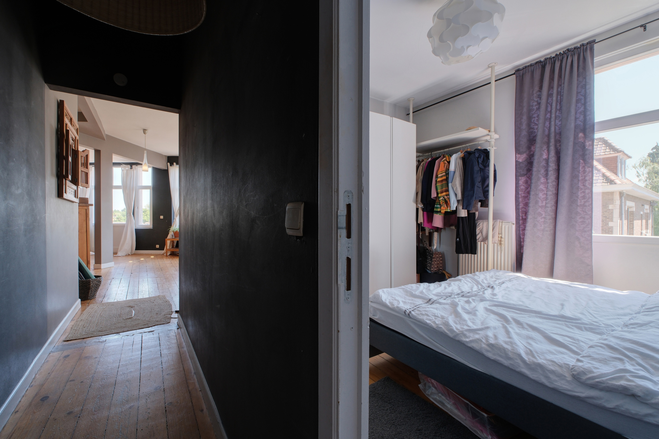 Un hall d’entrée distribuant une première chambre avec balcon,