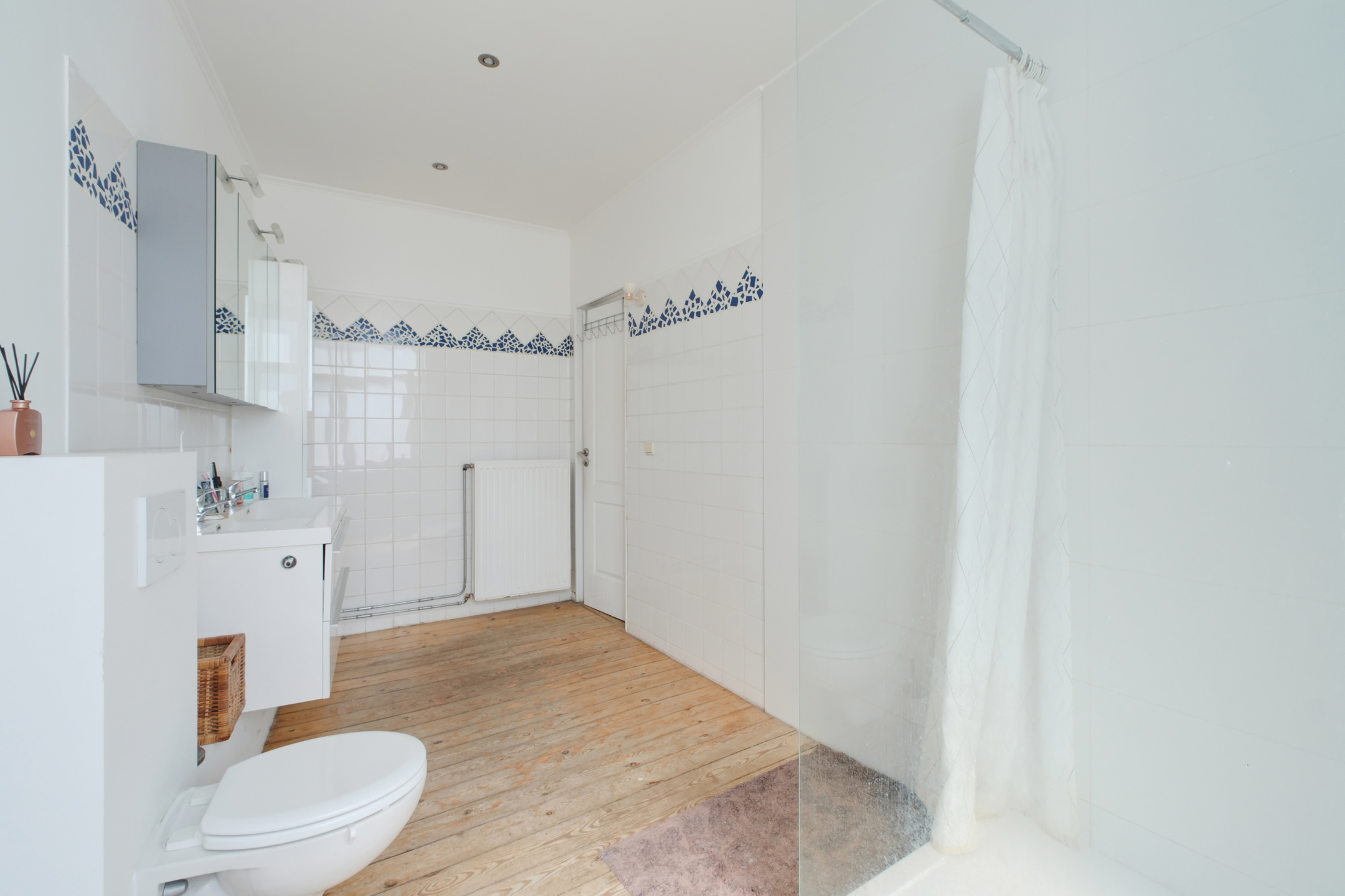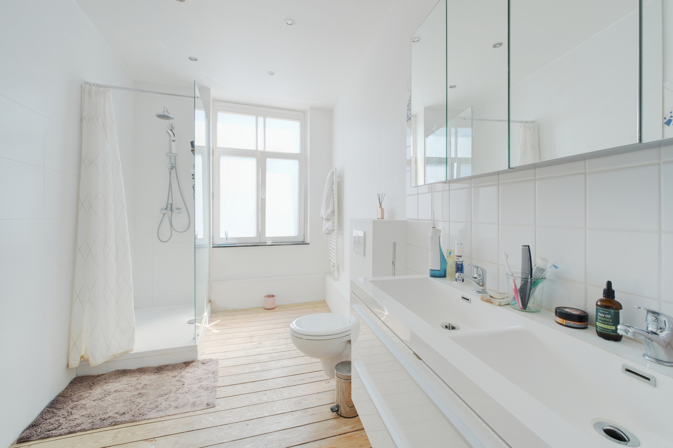 Une salle de bain avec douche, double lavabo et toilette,