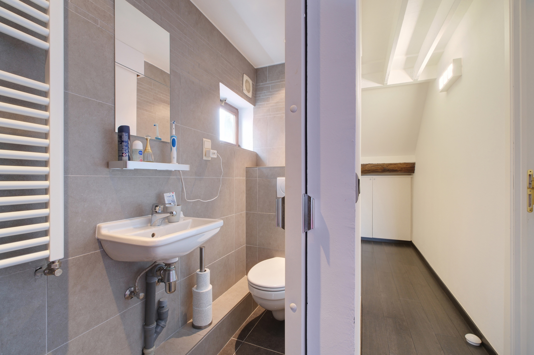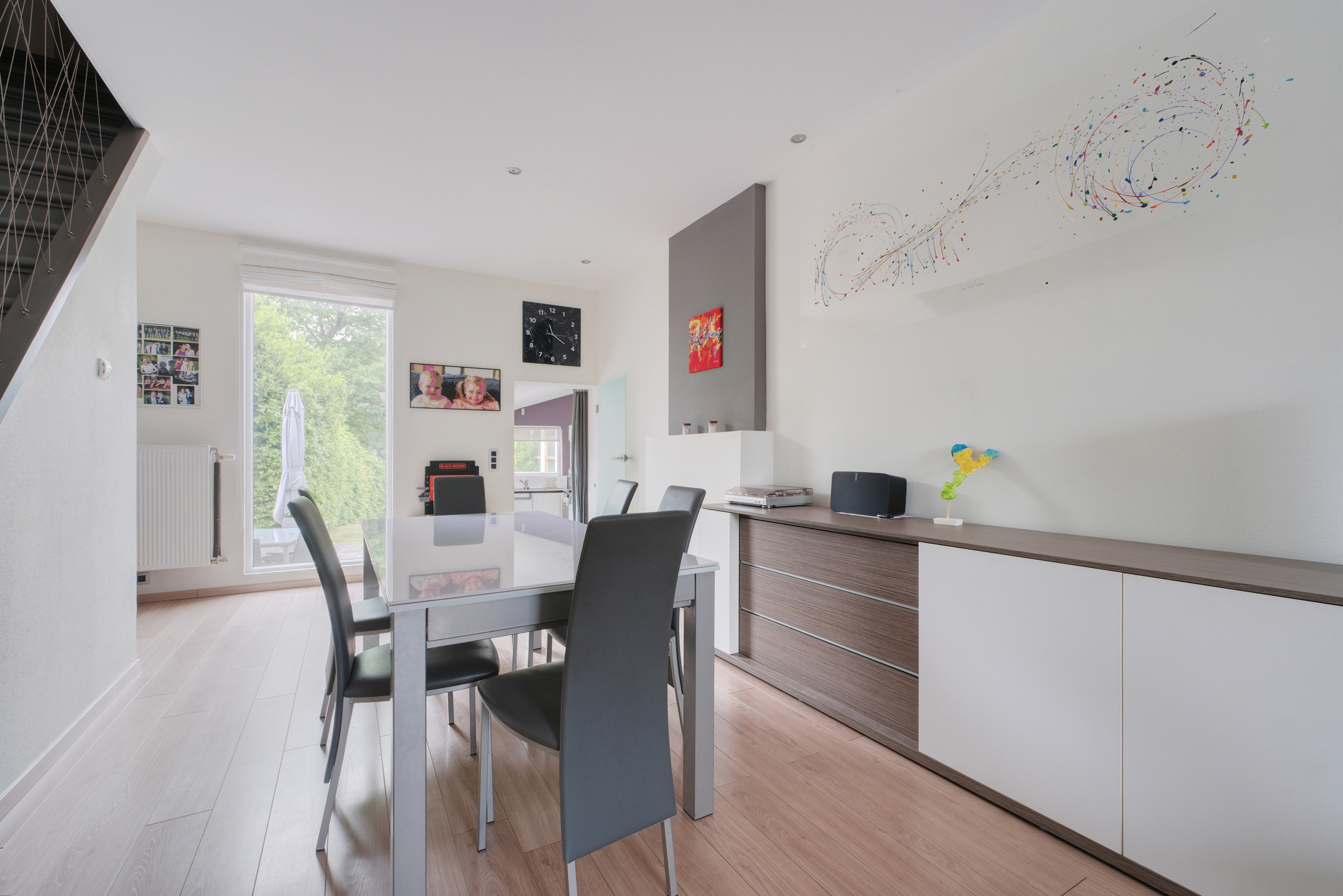 Au rez-de-chaussée, un hall d'entrée et un espace vestiaire/bureau ainsi qu’une toilette séparée. Le séjour est lumineux et bénéficie d'une jolie vue vers le jardin. La cuisine est conviviale et entièrement équipée avec des appareils de qualité et donne accès à la terrasse et au jardin joliment aménagé.